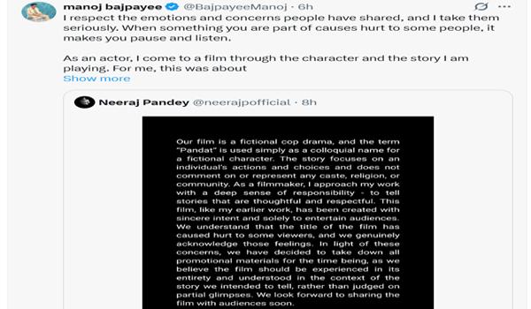 विवाद बढ़ने के बाद, डायरेक्टर-प्रोड्यूसर नीरज पांडे ने घोषणा की कि किसी भी गलतफहमी से बचने के लिए फिल्म का टीज़र हटा दिया गया है। उन्होंने कहा कि फिल्म का मकसद किसी खास जाति या समुदाय को टारगेट करना नहीं है। एक्टर मनोज बाजपेयी ने भी सोशल मीडिया पर एक बयान जारी कर कहा कि वह लोगों की भावनाओं का सम्मान करते हैं और यह फिल्म एक "दोषी इंसान" की कहानी है, न कि किसी ग्रुप पर कोई कमेंट्री।